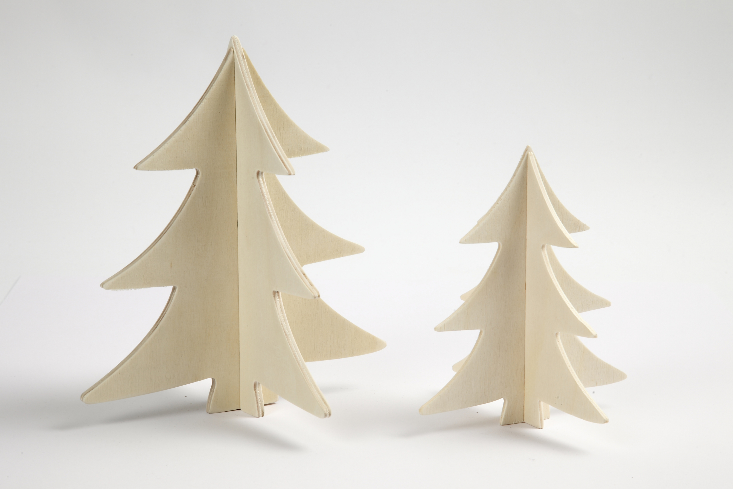 3D Weihnachtsbaum, H 13+18 cm, Sperrholz, 2Stck.. Weihnachtsbaum aus hellem Holz – mit Schlitzen zum Zusammenstecken. Set mit 2 Größen. Lieferung erfolgt zerlegt.