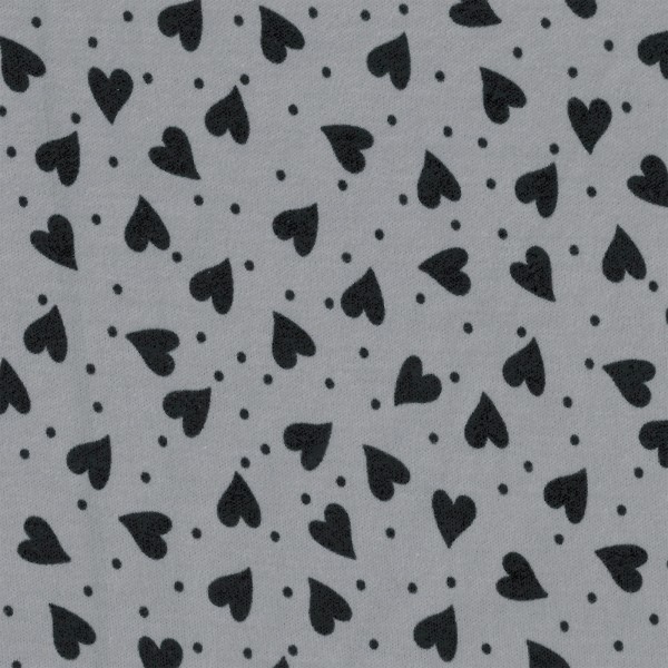 Bio-Interlock – Heartbeats alloy grau/schwarz, 140 cm. lustige Herzen und kleine Punkte für Kleidung wie Babybodies, Strampler,Shirts, Heimtextilien wie Bettwäsche, Kissen . 100% Bio-Baumwolle aus kontrolliert biologischem Anbau (kbA). Gewicht 185 g/m2, Brei