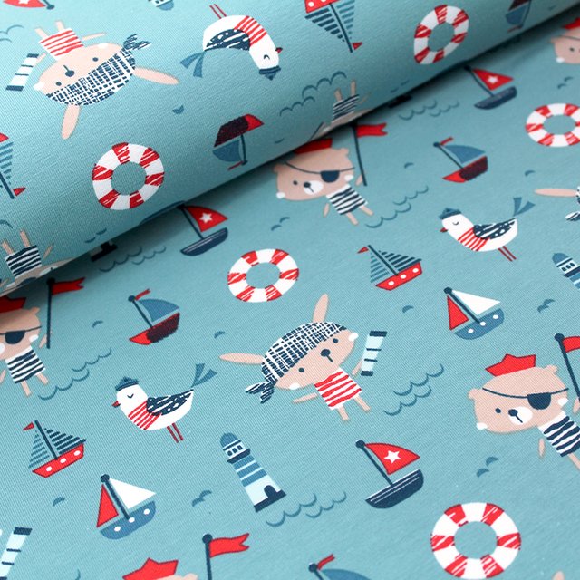 Bio-Jersey Piraten blau, . 95 % Bio-Baumwolle, 5 % Elasthan. , Breite: 160cm, Gewicht: 210g/m²