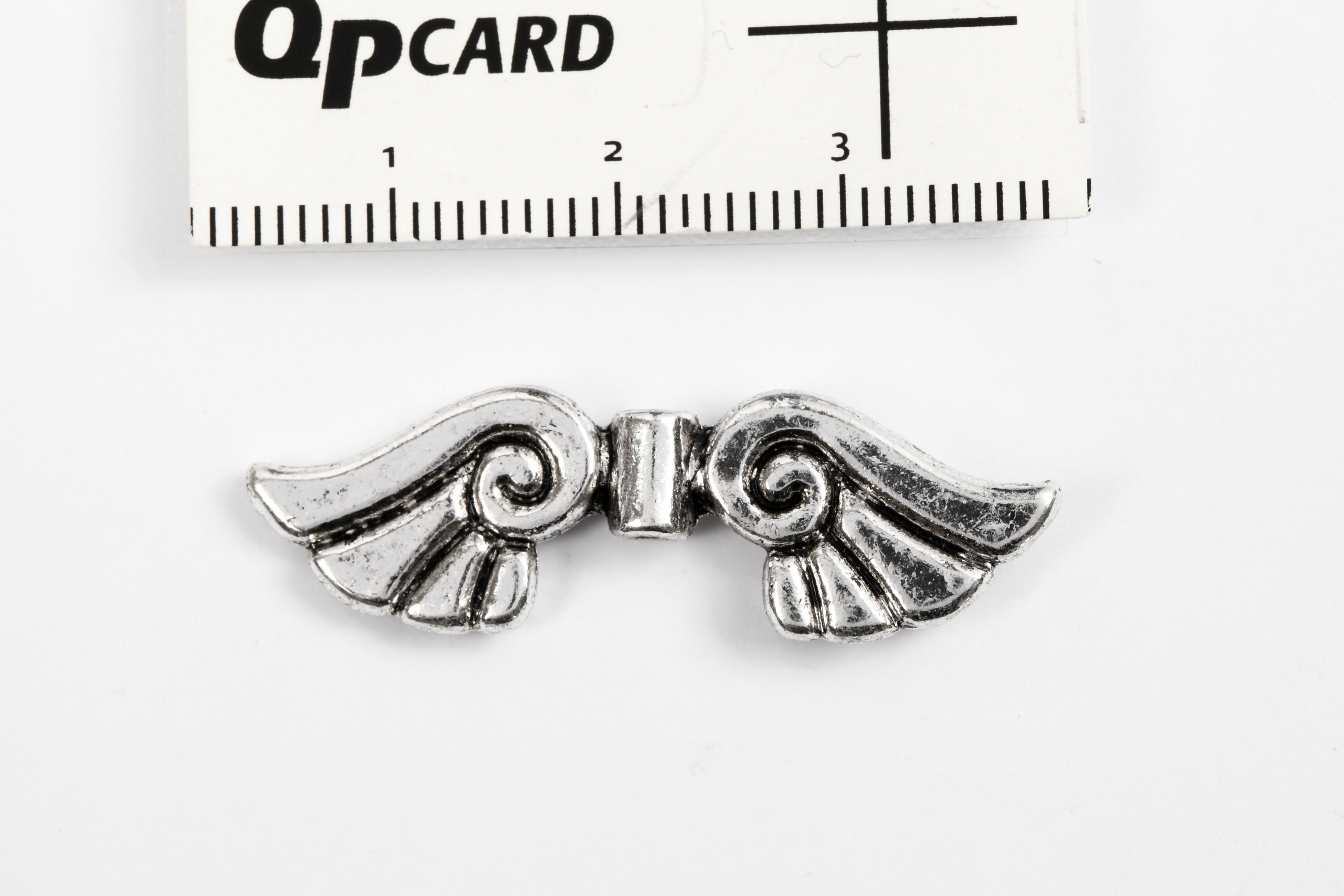 Flügel, B 35 mm, Lochgröße 1,5 mm, Antiksilber, 1 Stck.. Aus Metall – mit vertikalem Loch.