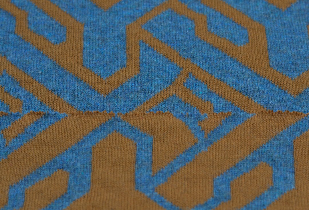 Jacquardstrick mit Fransen, Doubleface, blau/braun grafisch. Breite: 185cm, Gewicht 650g/lfm, 50% Wolle, 38% Baumwolle, 6% Polyester, 6% Polyamid