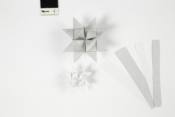 Papierstreifen für Flechtsterne, B 15+25 mm, D: 6,5+11,5 cm, Weiß, Glitter und Lack, 40Streifen, L 44+86 cm. P. enthält 16 St. mit Glitter- und 24 St. mit Lack-Oberfläche.