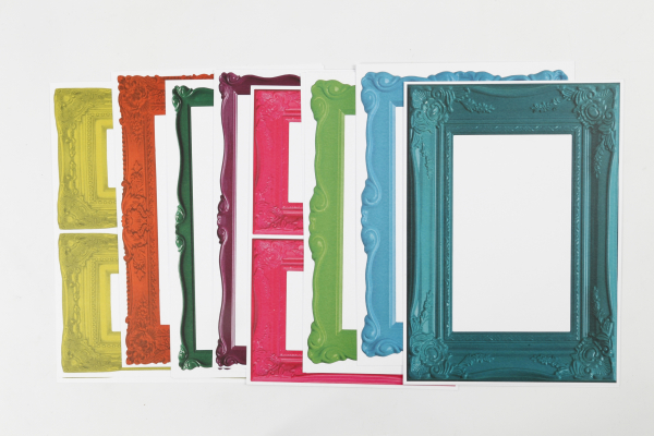 Rahmen, Blatt 26,2×18,5 cm, kräftige Farben. . Rechteckige Rahmen aus kräftigem Karton (230 g). Das Innenmaß variiert wegen der verschiedenen Rahmendicken. Pck. mit 12 großen und 8 kleinen Rahmen.