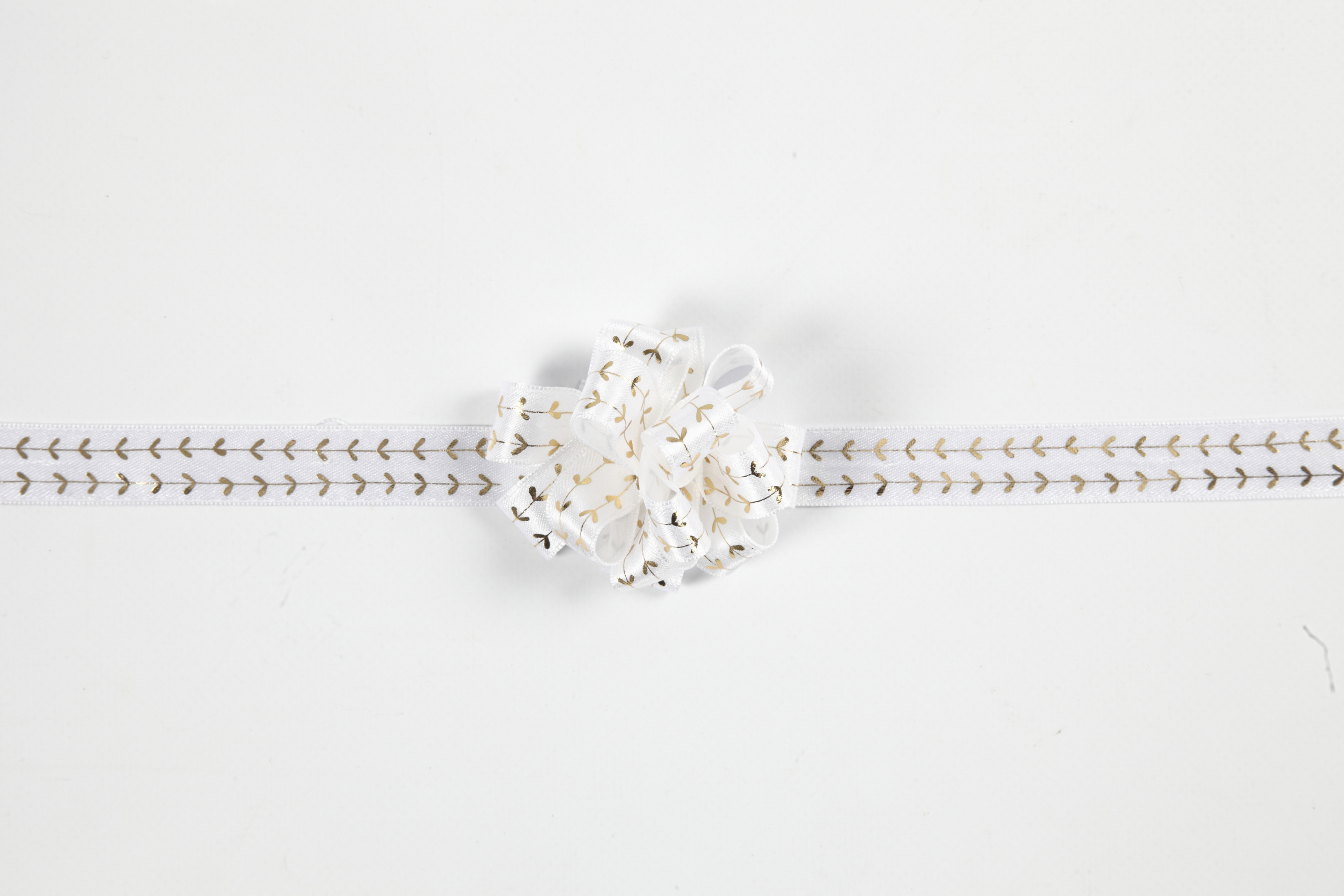 Susifix Band, B 18 mm, Weiß, Herzen, 5m. Effektvolles Band mit goldenen Sternen und einer schmalen Kordel, die die Mitte des Bands durchzieht. Zieht man die Kordel straff zusammen, bildet sich eine bauschige Schleife.