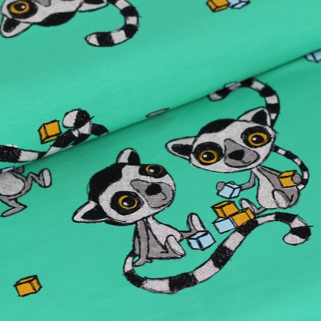 Bio-Jersey Tiny Monsters türkis, . 95 % Bio-Baumwolle, 5 % Elasthan. , Breite: 170cm, Gewicht: 210g/m².