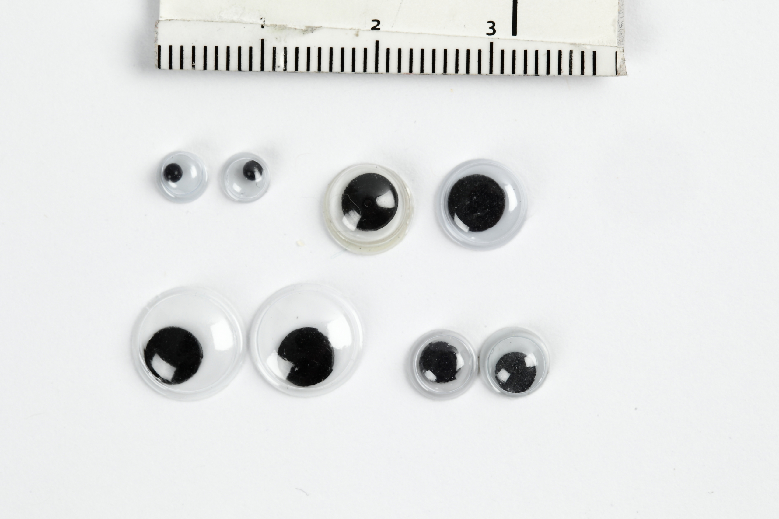 Wackelaugen, D: 4+6+8+10 mm, nicht klebend, 40sort.. Wackelaugen mit flacher Rückseite und beweglichen Pupillen. . Packung mit 4 Größen à 10 Stck.